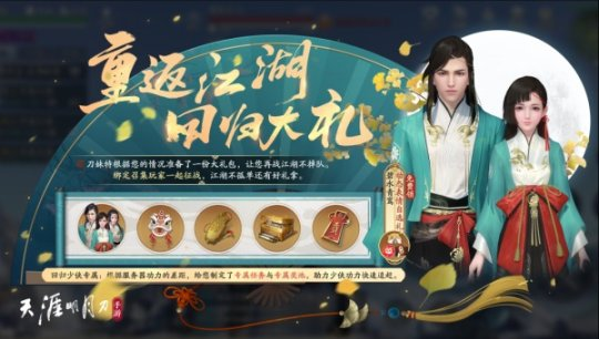 陌上花開,呼朋引伴!重回江湖活動(dòng)現(xiàn)已開啟~參與活動(dòng)完成任務(wù)即可兌換【碧水青鸞】、【少年魂】等精美外觀,還有天涯令·四、神品心法自選禮等稀缺資源等你帶回家~少俠可在游戲內(nèi)通過福利-重返江湖參與活動(dòng)。
