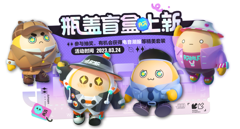 活動內(nèi)容:新一季的瓶蓋盲盒外觀上新啦!想要穿上電音潮服成為潮酷歌手、換上安保套裝守護蛋仔島,還是一身偵探套裝化身明察秋毫的名偵探呢?更多精美外觀,等著蛋仔們前來收集!