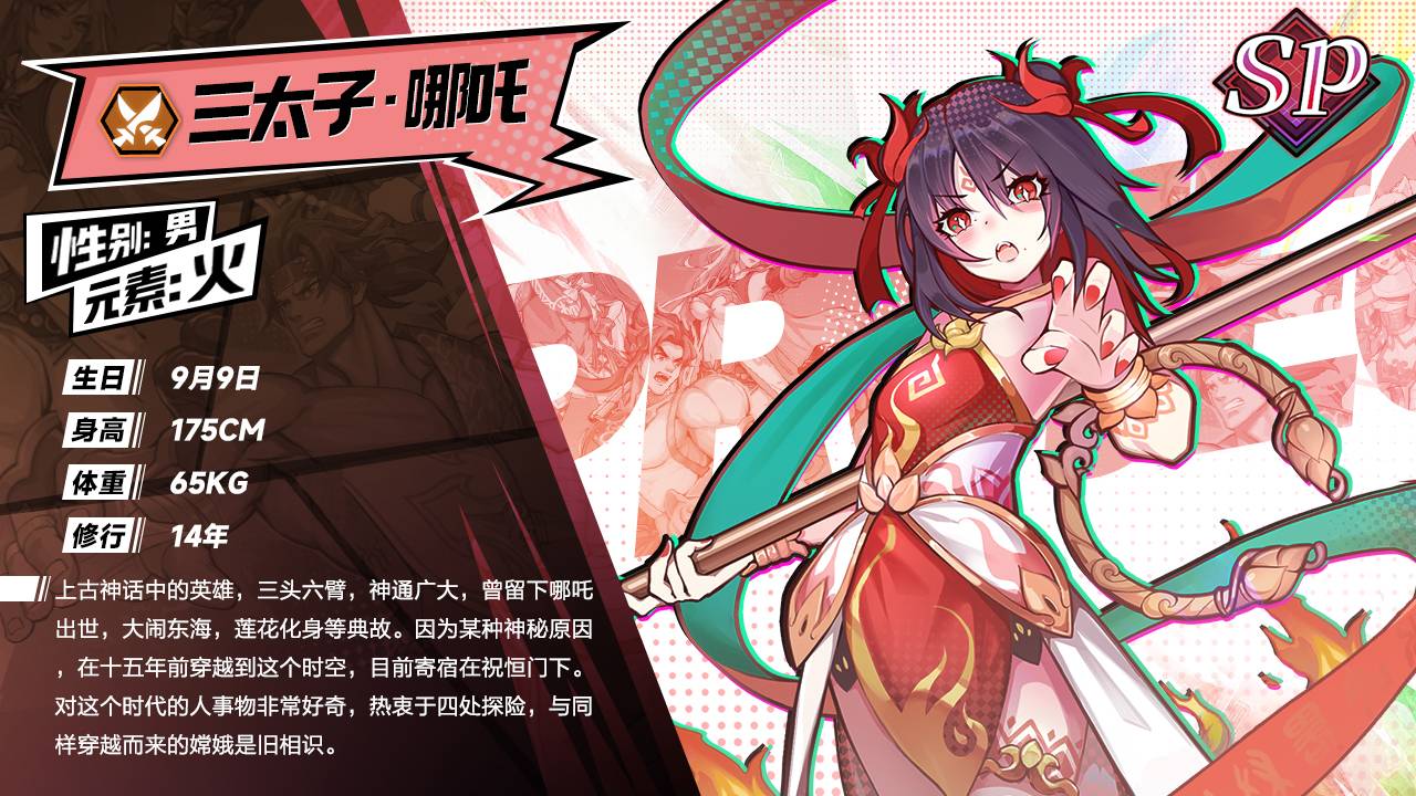上古神話中的英雄,三頭六臂,神通廣大,曾留下哪吒出世,大鬧東海,蓮花化身等典故。因為某種神秘原因,在十五年前穿越到這個時空,目前寄宿在祝恒門下。對這個時代的人事物非常好奇,熱衷于四處探險,與同樣穿越而來的嫦娥是舊相識。