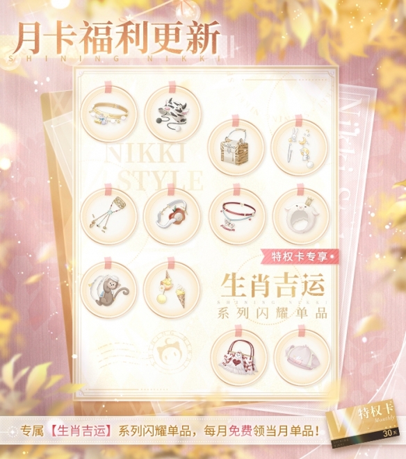 詳細(xì)說(shuō)明:特權(quán)卡專屬系列閃耀單品更新,每月可免費(fèi)領(lǐng)當(dāng)月【生肖吉運(yùn)】系列閃耀單品!