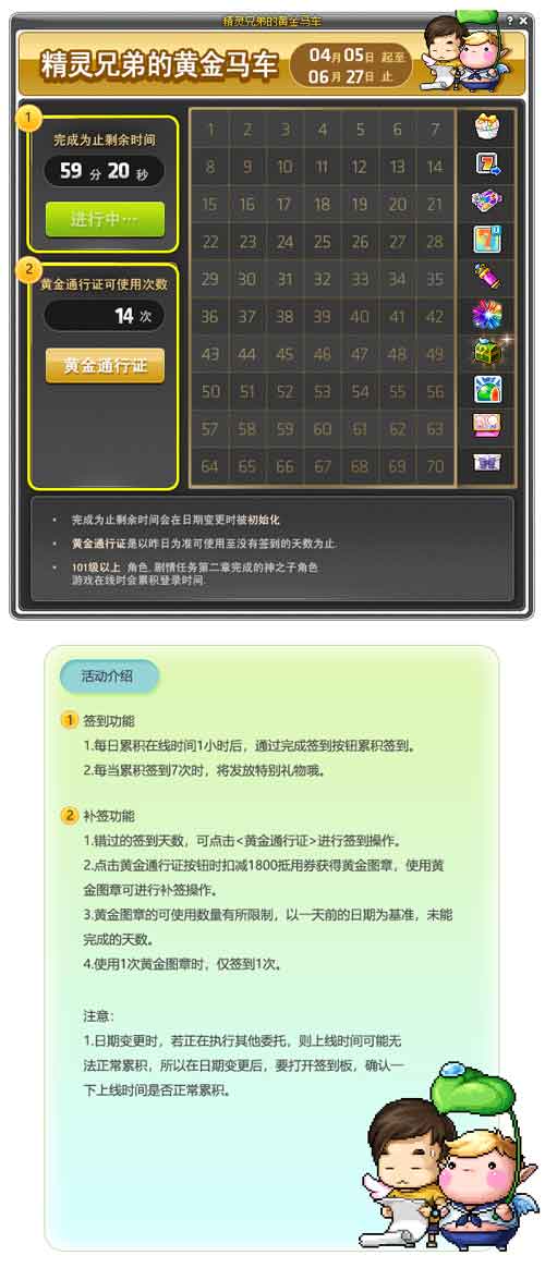 4月5日起至6月27日,點(diǎn)擊左側(cè)圖標(biāo),打開(kāi)精靈兄弟黃金馬車(chē)簽到界面,每日累積在線(xiàn)時(shí)間1小時(shí),通過(guò)完成按鈕累積簽到。蓋上簽到圖章,即可獲得大量禮物哦~