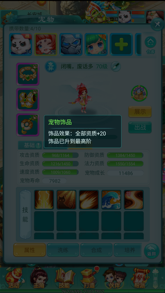 寵物飾品每一個(gè)階段都可以給寵物提升全體資質(zhì)5點(diǎn)...看上去雖然不多,但由于飾品一共有4個(gè)階段,也就是最多可以提高全體資質(zhì)20點(diǎn)!量變形成質(zhì)變,這時(shí)候你寵物的實(shí)力早已經(jīng)不可同日而語(yǔ)了。