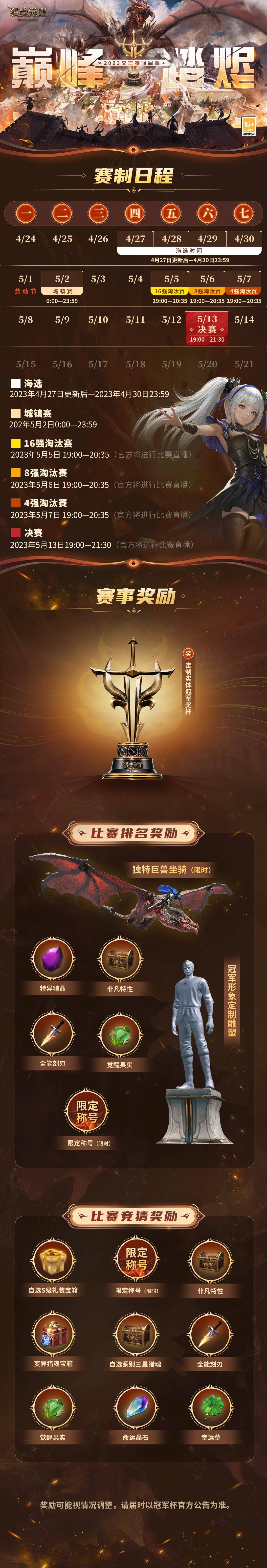 熱血賽事一觸即發(fā),豪華實體冠軍獎杯、游戲內(nèi)定制雕像、艾蘭特首只巨獸坐騎等無上榮譽,等待最終守住巔峰之席的最強者收入囊中!