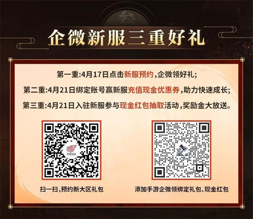 第二重:4月21日,已添加企微賬號的玩家,綁定游戲賬號后,即可贏取新服充值現(xiàn)金優(yōu)惠券,助力快速成長;