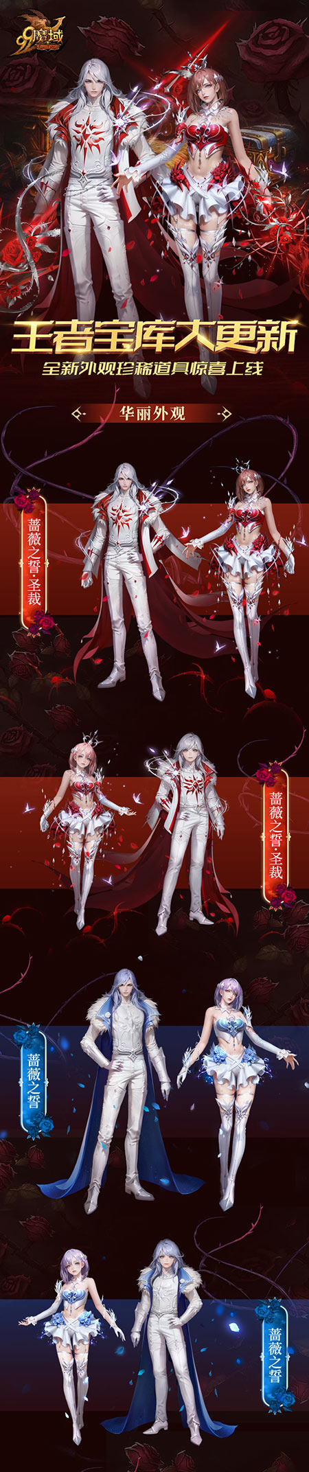 春天是鮮花綻放的時(shí)節(jié),而此次王者寶庫的外觀更新,也以一朵薔薇的盛開為主題。薔薇之誓·圣裁系列外觀采用熱烈的紅白色調(diào)搭配,看似簡約卻處處上心細(xì)節(jié)設(shè)計(jì)。男裝的胸前烙印著盛開的紅薔薇,一席風(fēng)衣格外的英姿颯爽,女裝則采用了白色百褶短裙搭配紅色抹胸設(shè)計(jì),時(shí)尚中帶有一股暗涌的熱情,仿佛在夜里熾熱盛開一般。而薔薇之誓系列外觀更突顯神秘清冷,冷色調(diào)的白紫搭配如空空幽谷,讓人浮想聯(lián)翩。