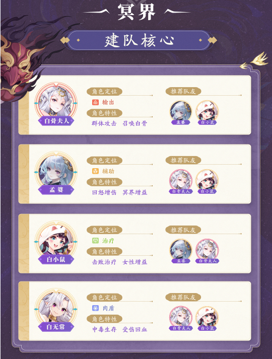 在游戲進度進入中后期時,隨著PVE副本難度的不斷提升、競技場對手練度的不斷提高,保證隊伍生存和爆發(fā)能力就顯得尤為重要。正因此,在官方盤點的全角色梯度排行中,天后、唐僧、白小鼠、孔雀公主等奶媽角色才會被列為“建隊核心”。而像月老、孟婆這樣為隊友提升爆發(fā)能力的角色也是當之無愧的第一梯隊。