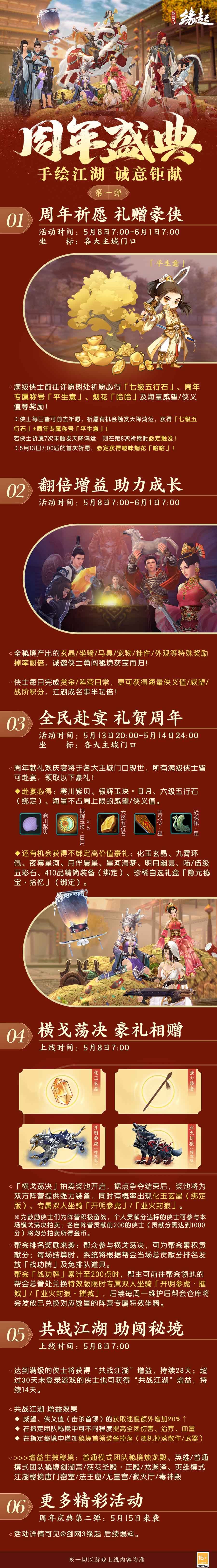 歡慶周年,驚喜不斷。《劍網(wǎng)3緣起》公測周年慶典5月8日啟幕,諸多周年活動(dòng)內(nèi)容即將登場!俠士們將不僅能夠獲得「七級五行石」和周年稱號「平生意」等豪禮,更有翻倍增益等活動(dòng)助俠成名,為緣起周年增色添彩!話不多說,快一起來看看吧!