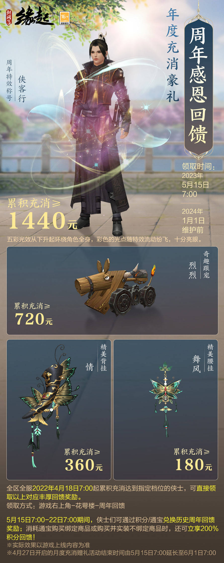 周年充消回饋同步亮相!全區(qū)全服指定期間累積充消達(dá)到指定檔位的俠士,可直接領(lǐng)取對應(yīng)豐厚回饋獎(jiǎng)勵(lì),根據(jù)檔位獲贈(zèng)紀(jì)念周年特效稱號【俠客行】、奇趣跟寵【烈烈】、精美背掛【情】、精美腰掛【舞風(fēng)】!