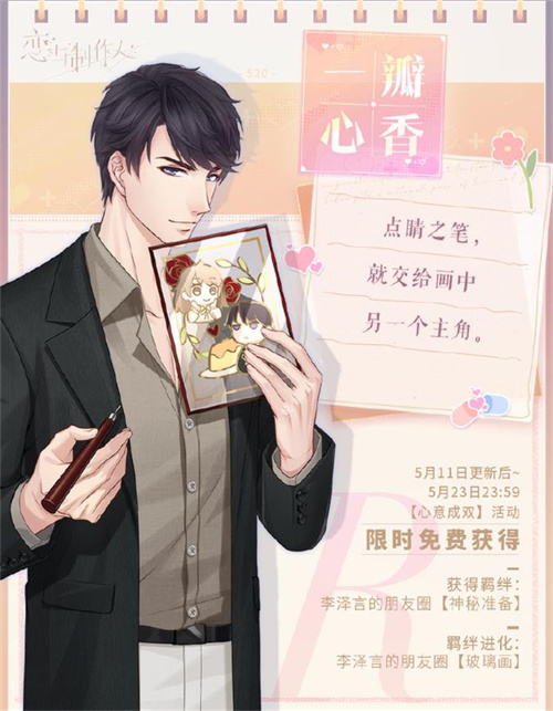 5月11日更新后~5月23日,可從主界面或精彩活動【心意成雙】自選角色進入活動界面?;顒悠陂g,完成任意主線關卡,即可額外獲得【繪染顏料】。消耗【繪染顏料】,點擊填色區(qū)域,即可自由選擇喜歡的顏色進行填色。完成所有填色區(qū)域的上色后,即可解鎖他的【手作蜜語】。每位角色首次分享后,均可獲得該角色對應的【520紀念R羈絆】。準備的心意,配合的默契,屬于天生一對的他和你。