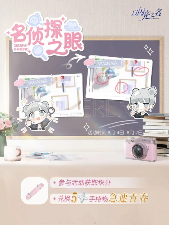 名偵探之眼開啟!調(diào)查累積偵探積分,可以獲取五星手持物【急速青春】、拍照萌拍【都市風(fēng)尚】、鉆石*30、潮流色卡*9及多種材料道具獎勵!