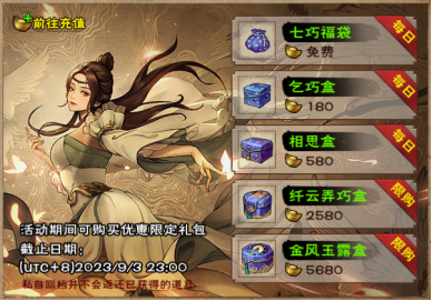 愿天下有情人終成眷屬,全新特惠節(jié)日禮包活動(dòng)同步開啟。金風(fēng)玉露盒中將會(huì)放置江湖敕令。有需要的俠士可以根據(jù)實(shí)際情況選擇禮包購(gòu)買~