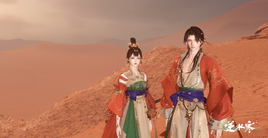 這個配色給人的感覺就是很唐宮夜宴,女性時裝的發(fā)型與頭飾非常的符合唐代美女的形象,背后還有個紅色飄帶,男性時裝的發(fā)型終于不再是千篇一律的長發(fā)了,造型依然是玩家們最愛的深V。
