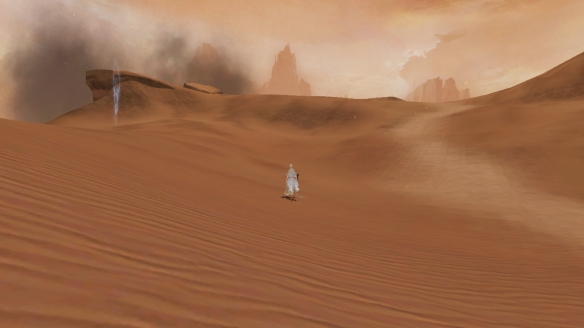 重新回到【朔風(fēng)漠-無衣鄉(xiāng)-血河攤】神石處,向地圖的西北方向走,第七個沙丘就在眼前(大致坐標(biāo)為東1541,南1008)。