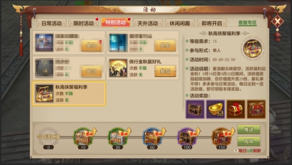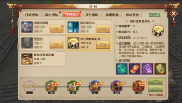 麥浪翻云映碧空,活躍福利迎金秋!9月14日至9月20日期間,活躍值獎(jiǎng)勵(lì)超級(jí)加磅,總價(jià)值提升至25倍,豪禮享不停!少俠只需參與日?;顒?dòng),每日達(dá)到一定活躍值,即可領(lǐng)取豐厚獎(jiǎng)勵(lì)!其中包含聚靈寶箱、萬象要訣寶箱、三材通易寶匣、屬性攻寶石箱(3級(jí))等多種日常好禮,七日獲取全部獎(jiǎng)勵(lì)后即可合成一顆五級(jí)屬性攻寶石!