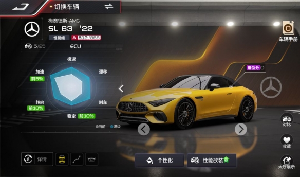 梅賽德斯-AMG SL 63 '22在《巔峰極速》中屬于【性能組】賽車。在六大屬性中,【加速】性能表現(xiàn)最為突出,為前5%;在【轉(zhuǎn)向】【穩(wěn)定】上的表現(xiàn)也很優(yōu)秀,排名在前10%。
