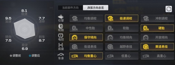小極領略過SL 63 '22的風采后,試著改裝了下,這樣的方向比較適合小極的手感:引擎-極速調(diào)教、輪胎-硬胎、電控-保守傾向、底盤-賽道懸掛、車身-均衡重心設定。當然了,傳奇車的培養(yǎng)成本比較高,所以在前期小極重點推薦針對引擎、電控、輪胎三個部位進行強化~