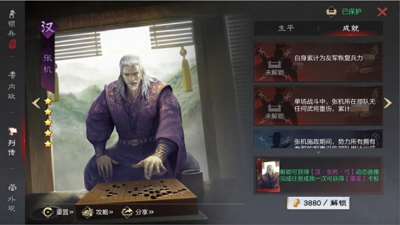 主公可以通過(guò)消耗四通玉符或榮譽(yù)來(lái)為自己心儀的武將解鎖其成就以記錄事跡,其中在主公首次查看任意五星武將成就時(shí)免費(fèi)解鎖武將-【漢·盧植·騎】、【漢·盧植·騎·SP】,<第一賽季>玩家將隨次日登錄獎(jiǎng)勵(lì)獲得【漢·盧植·騎·SP】時(shí)一并解鎖。解鎖后將獲得該武將專屬的成就動(dòng)態(tài)畫(huà)像。