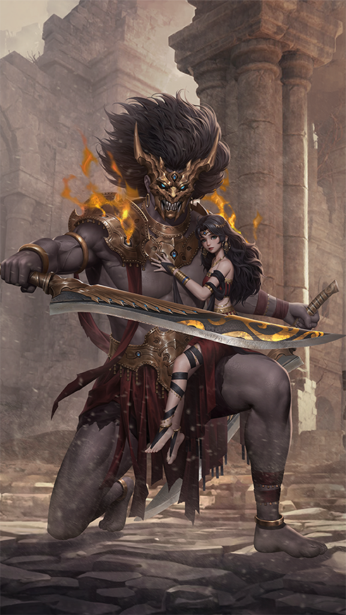 傀儡頭戴神秘面具,兩道深邃的眼眸凝視著前方。身形雄壯威猛,如同一座不可動搖的山巒,靜靜地守候在原地。對任何敢侵犯少女的人,傀儡都不惜用他手中的長刀,賜予他們最后的審判!