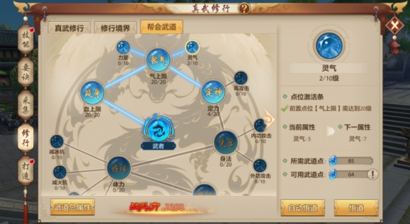 少俠可通過(guò)【技能】-【修行】界面進(jìn)入【幫會(huì)武道】,幫會(huì)武道分為武者、武師兩種境界,武者境界在完成前置任務(wù)后突破,武師境界在武者所有點(diǎn)位達(dá)到滿級(jí)后突破。突破武道境界后,即可依次對(duì)各個(gè)武道點(diǎn)位進(jìn)行悟道修煉。循序漸進(jìn)升點(diǎn)位,各類屬性等你來(lái)點(diǎn)!
