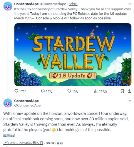 2月27日,《星露谷物語(yǔ)》作者ConcernedApe宣布游戲1.6版本將于3月19日正式上線PC,主機(jī)版和移動(dòng)版將在隨后推出,該更新最初于2023年4月公布。