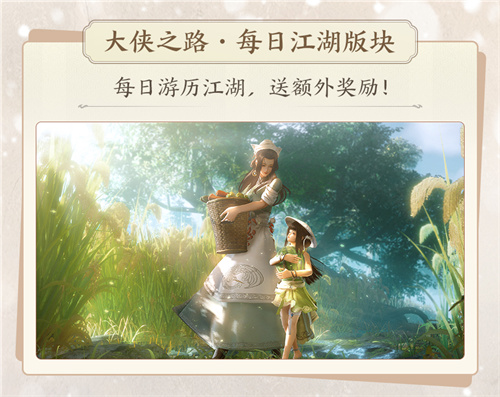 既得趣味又拿獎(jiǎng)勵(lì),關(guān)鍵還不費(fèi)時(shí),快來瞧一瞧!大俠之路新增“每日江湖”版塊驚喜滿滿,只需花費(fèi)5-10分鐘,完成每日游歷江湖小任務(wù),即可累積江湖點(diǎn)數(shù)獲得額外獎(jiǎng)勵(lì)!